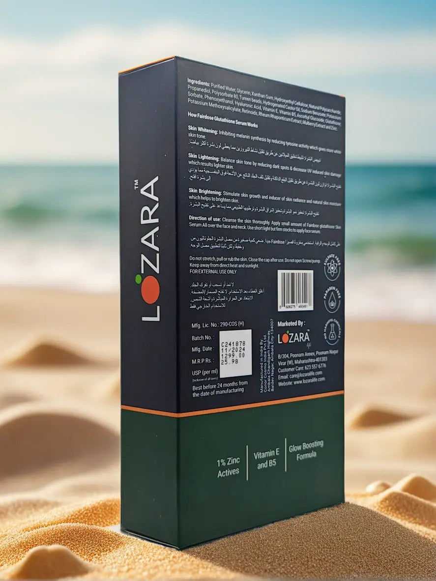 Fairdose Glutathione Serum is an advanced Skin brightening & lightening anti-aging serum that features a blend of Glutathione, Hyaluronic acid, Retinoids, Zinc Actives, Vitamin E & B5. This Glow serum is formulated with specially developed encapsulation technology to enhance its glow-boosting effects.